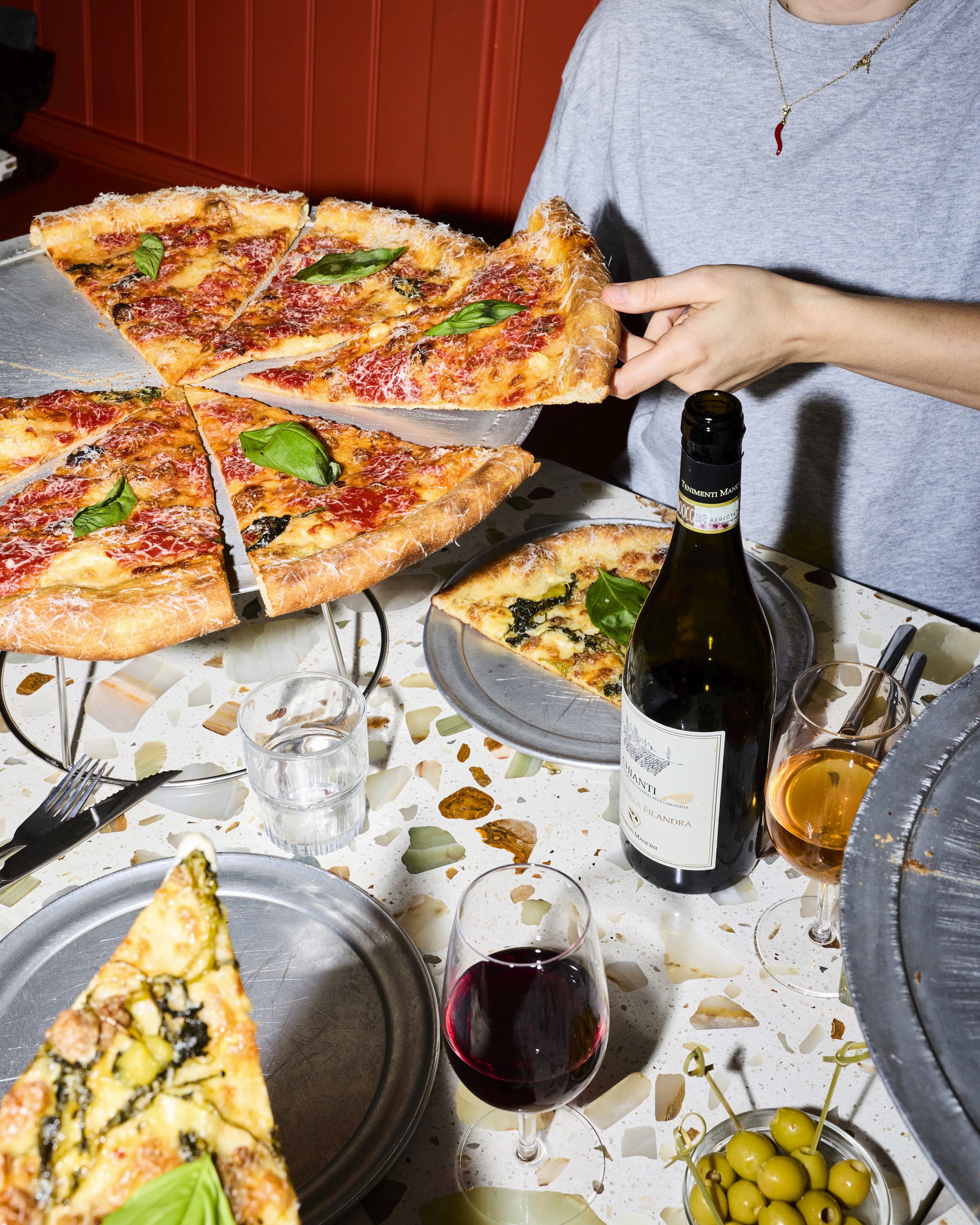N'duja mezcal marinara sauce, fior di latte mozzarella, buffalo mozzarella, scamorza, 22-month parmesan, basil pesto